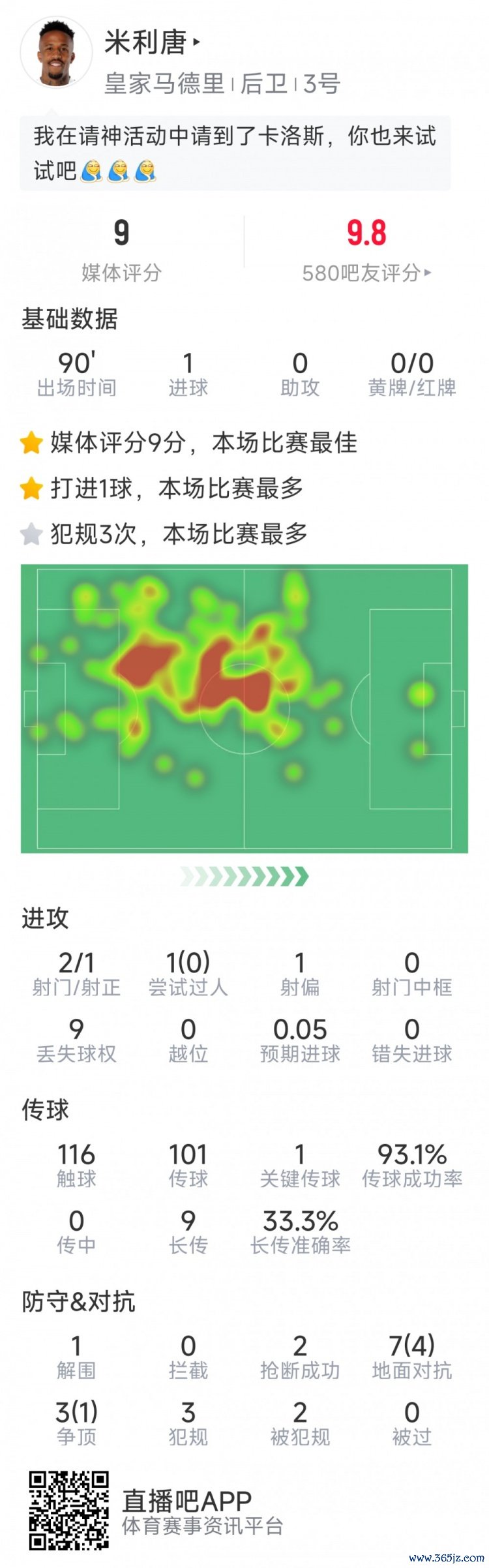 米利唐本场数据:打进惊天远射,2射1正,2次抄截 ,评分9分最高