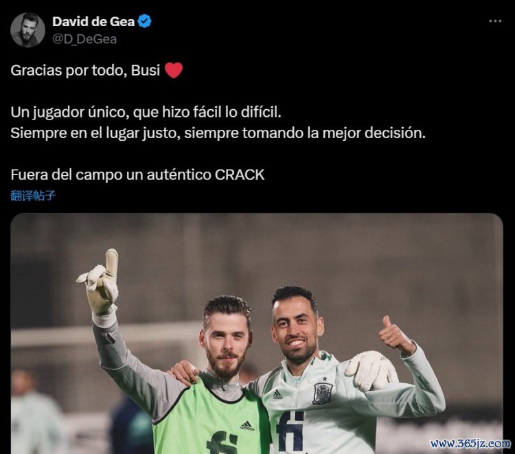 9月26日讯 在布斯克茨宣布将在本赛季结束退役后,他的前国家队队友德赫亚更新了社交媒体。