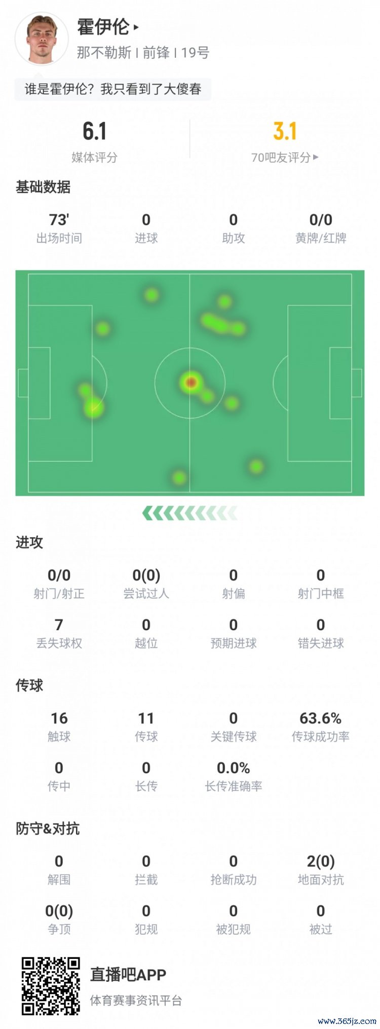 9月29日讯 那不勒斯在本轮意甲1-2输给米兰,霍伊伦杆位出场73分钟,巴黎圣日耳曼体育直播以下是他的个人数据。