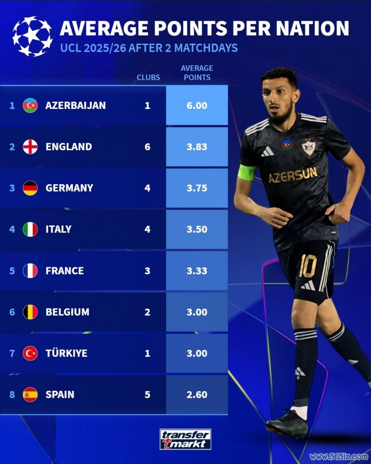10月2日讯 欧冠第二轮赛事 战罢,德国转会市场统计了各国球队两轮过后的平均积分,巴黎圣日耳曼阿塞拜疆6分最高, 尤文图斯体育直播英格兰3.83分, 中超德国3.75分。
