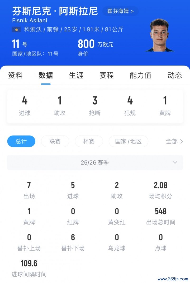 阿斯拉尼现年23岁,身高1.91米,他本赛季出场7次,贡献5球2助,现身价800万欧,他与霍芬海姆的合同将在2029年到期。