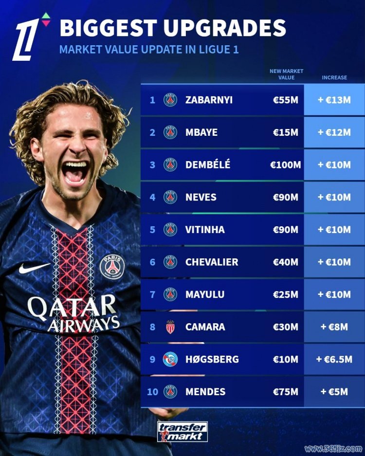 10月12日讯 德国转会市场更新法甲球员的身价,并列出身价上涨榜单,扎巴尔尼+1300万欧居首,巴黎球员占据前7名。