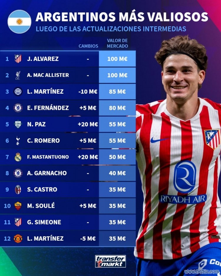 阿根廷球员德回转 价榜:小蜘蛛、麦卡1亿欧居首,帕斯5500万欧