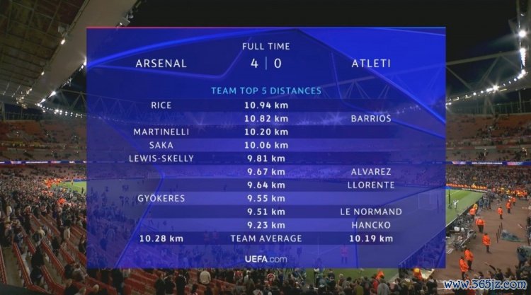 赛后两队跑动数据显示,阿森纳全队平均移动距离 为10.28KM略高于马竞的10.19KM。但是,巴黎圣日耳曼在移动距离 超过10KM的球员中, 尤文图斯足球直播阿森纳有3人拜仁9-1皇马, 中超分别为赖斯(全场最高10.94KM)、马丁内利和萨卡,而马竞仅有1人为巴里奥斯。