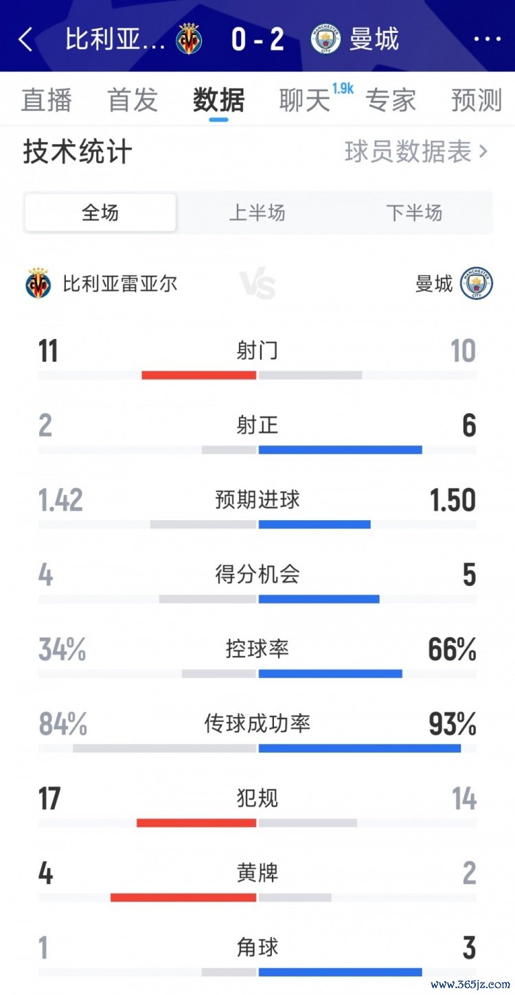 10月22日讯 在本轮欧冠, 尤文图斯体育直播曼城2-0击败比利亚雷亚尔。以下为双方全场数据对比: