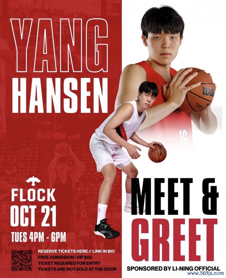 10月14日讯 据开拓者记者Victor Sun报道,杨瀚森将于当地时间10月21日下午4:00-6:00参加李宁在波特兰当地FLOCK美食广场举办的球迷见面会活动。