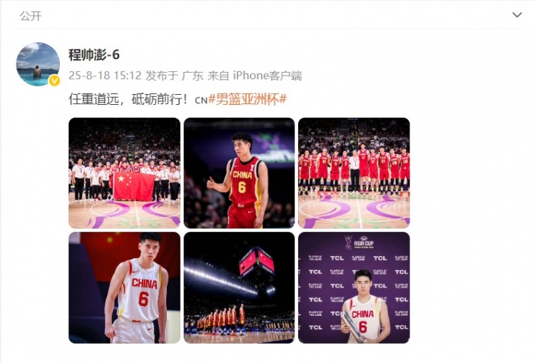 赛事 结束后,程帅澎在社媒上谈到了这次亚洲杯,写道:“任重道远,砥砺前行!🇨🇳。”