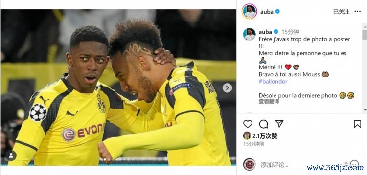 9月23日讯 奥巴梅扬更新社媒动态,祝贺前队友登贝莱获得金球奖。