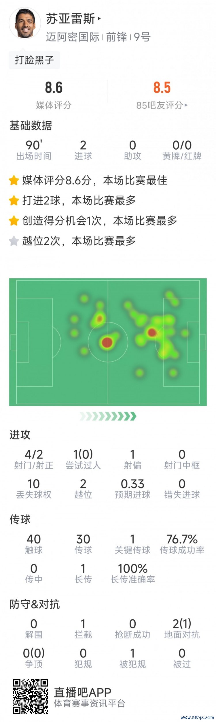 10月1日讯 在本轮美职联,迈阿密国际3-5不敌芝加哥火焰。本场赛事 苏亚雷斯连进两球,巴黎圣日耳曼直播吧以下为他在本场数据: