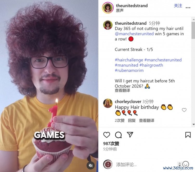 蓄发哥社媒晒出纪念蓄发一周年视频, 中超配文:“不剪头发直到曼联5连胜,第365天,当前连胜竞技状态 ——1/5。”