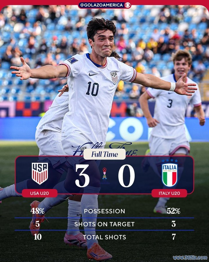 10月10日讯 世青赛(U20世界杯赛 )1/8总决赛 ,美国3-0击败意大利,晋级下一轮 8强。