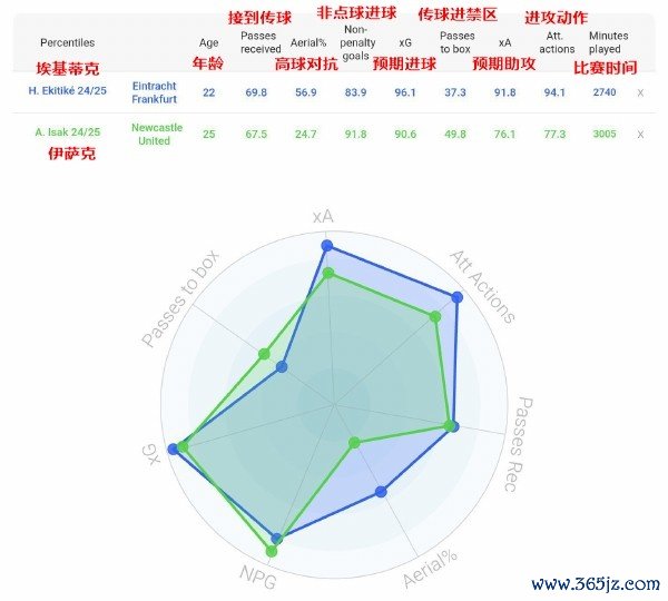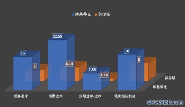 如果将埃基蒂克与伊萨克进行对比,除了得分 表现,以及传送球 进危险区域 数据处于劣势之外,埃基蒂克其他方面都是领跑 的。
