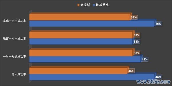 相比之下,埃基蒂克的脚下能力要强出不少。过人成功率高出10个百分点,同时作为一名高个子五号位,埃基蒂克不但能自己带球过人,还有着很好的无球移动意识和极大的跑动接应范围。