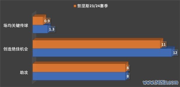 努涅斯在克洛普执教的最后一年打出过较高的水准,不只是得分 破双,助功 在英超也达到8个。