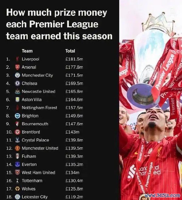 形成鲜明对比的是,上赛季利物浦在英超赢得第一名 ,他们能够获得1.815亿英镑奖金(近2.1亿欧)。更重要的是,利物浦的商业价值和赞助收益也会因此得到增长。