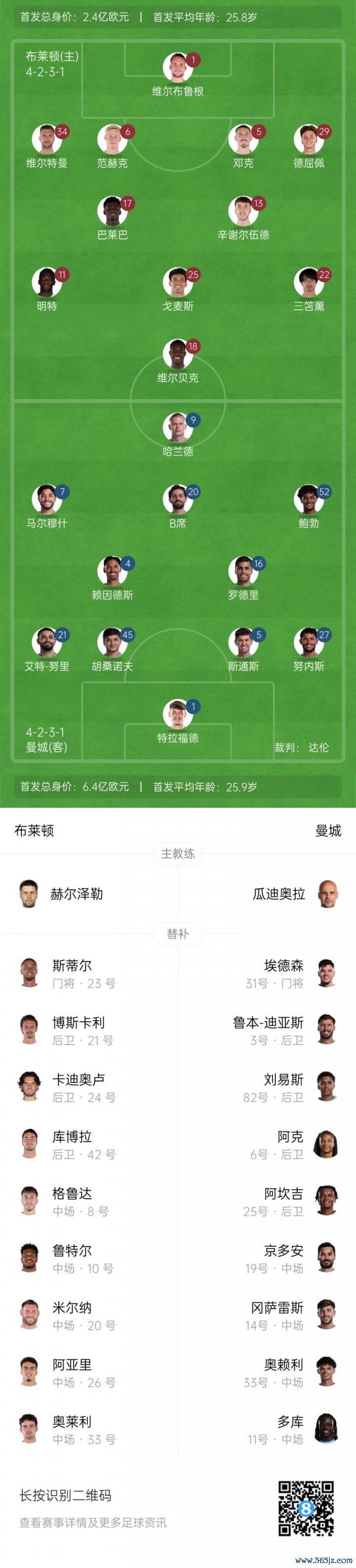 曼城客战布莱顿杆位:罗德里回归!特拉福德胡桑诺夫、三笘薰先发