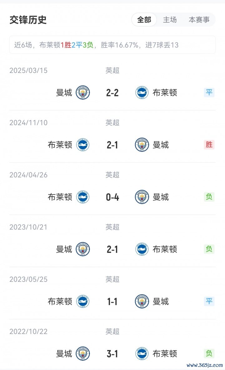 2017/18至2023/24赛季期间, 中超直播吧布莱顿对阵曼城的14场职业联赛 仅赢下两场(1胜1平12负)。