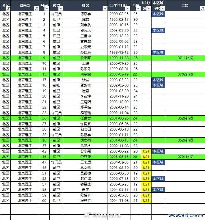 2025中乙职业联赛 (北区)夏转后各队报名名单(绿色为夏转新报名球员)