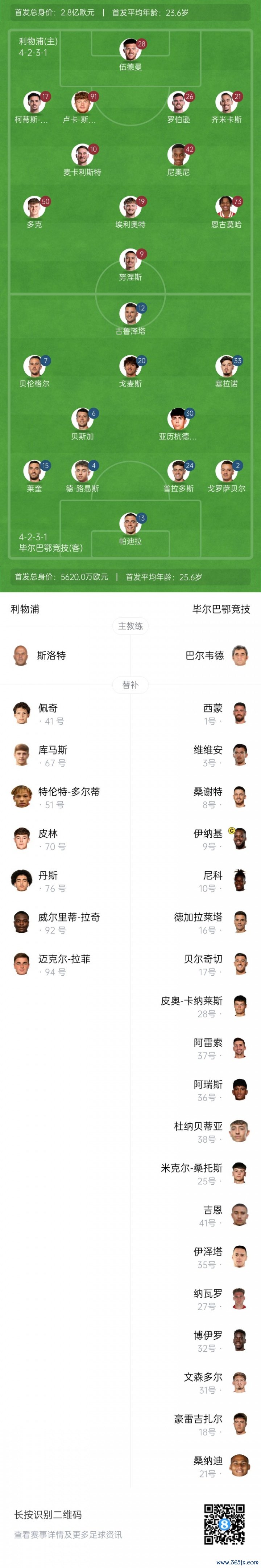 利物浦杆位:28-伍德曼、21-齐米卡斯、29-罗伯逊、91-斯蒂芬森、17-琼斯、10-麦卡利斯特、42-尼奥尼、50-多克、19-埃利奥特、73-恩古莫哈、9-努涅斯